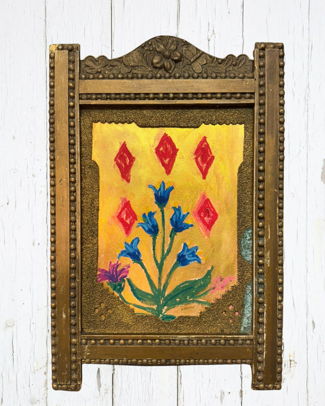 •Framed in Victorian, romantic gold painted frame with original inlay and hand carved dragon fly & floral details.