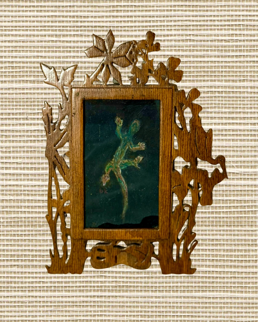 - Primative gecko illustration framed in an antique wooden Italian frame with hand-carved reticulated egret, flora and fauna details.