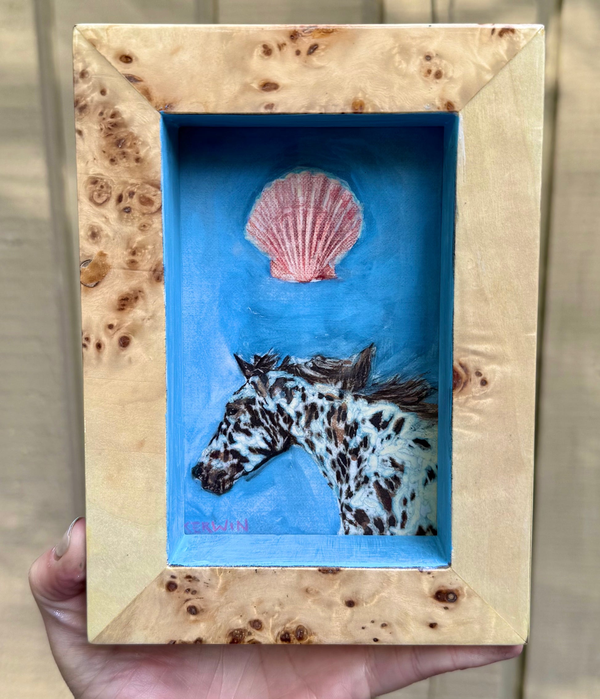 - Deep set frame with hand painted rabbit and blonde burl veneer.